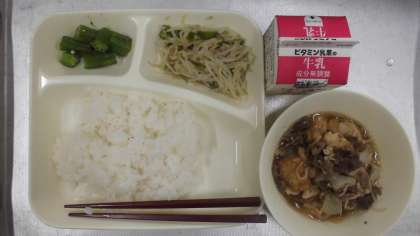 今日の給食のメニューは、すき焼き煮、オクラのかつお梅風味、もやしとピーマンのごま炒め、牛乳、ごはん、でした。すき焼き煮は牛肉の旨みがとけ出していて、その他の具材にも割り下がしみ込んでいて、ごはんとの相性もばっちりでした。オクラのかつお梅風味は梅肉を使ったドレッシングがかけられていてさっぱりとしていました。もやしとピーマンのごま炒めは塩こしょうとしょうゆで味つけられていて、いりごまの香りが感じられました。