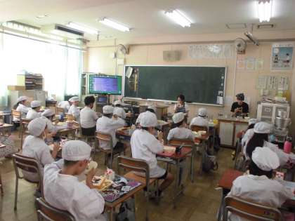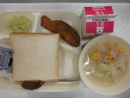 今日の給食のメニューは、サーモンフライ、豆乳スープ、キャベツのソテー、牛乳、パン、でした。サーモンフライはころもはサクッと揚げられていて、サーモンの身も厚くてふっくらとしていました。豆乳スープは豆乳のまろやかさが感じられ、やさしい味に仕上がっていました。細かく刻まれた野菜とベーコンが入っていました。キャベツのソテーはシンプルで、あっさりしていました。
