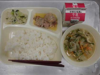 今日の給食のメニューは、鶏肉のしょうゆマヨネーズ焼き、五目汁、切干し大根のゆずの香和え、牛乳、ごはん、でした。鶏肉のしょうゆマヨネーズ焼きは鶏肉に料理酒、塩、しょうゆとマヨネーズを合わせたもので下味がつけられていてまろやかな感じに焼き上げられていました。五目汁はだしがしっかりとられていて、具材もたっぷりと入っていました。切干し大根のゆずの香和えはゆずの香りがほんのりとしてさっぱり感がありました。