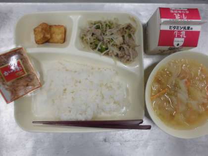 今日の給食のメニューは、ゴーヤチャンプルー、すまし汁、厚揚げの生姜醤油かけ、牛乳、ごはん、でした。ゴーヤチャンプルーはにがうりの苦味がアクセントになっていてかつおぶしをかけて食べました。すまし汁は透き通っただしの効いたスープに鶏肉と細かく刻まれたにんじん、たまねぎ、キャベツが入っていました。厚揚げの生姜醤油かけは甘辛い感じで、ごはんともよく合いました。