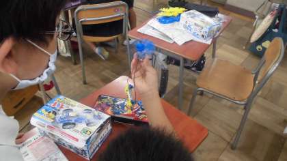 子どもたちは乾電池、モーター、プロペラなどを使って回路を作り、確かめることで理解を深めていました。プロペラが逆に回ったときには頭で理解しながらも、少しうれしそうに驚いていました。
