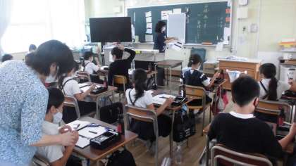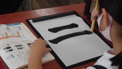 文字を書くときの筆の動かし方を「筆使い」といいます。3年生の子どもたちが筆使いに気をつけて「横画」を書いていました。1.始筆(書き始め)…ほ先の向きに気をつけて、筆をゆっくり下ろす。2.送筆(書いている途中)…ほ先の向きを変えない。3.終筆(書き終わり)…筆を止め、はらからほ先の方へ、ゆっくり上げる。教科書のお手本を見ながら、子どもたちは集中して取り組んでいました。