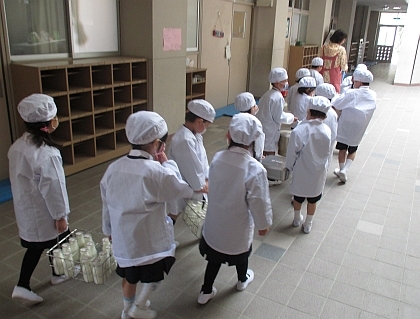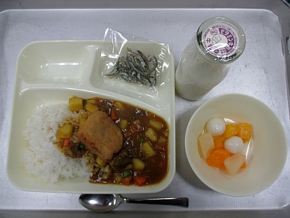 今年度の給食が始まりました。1年生も重い食缶や牛乳を慎重に運んでいました。今日は「入学祝い献立」で、メニューは、カツカレーライス、フルーツ白玉、ミニフィッシュと牛乳です。