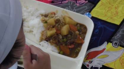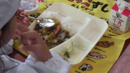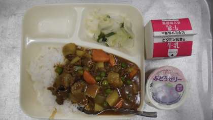 今日の給食のメニューはビーフカレーライス、野菜のピクルス、ぶどうゼリー、牛乳、でした。ビーフカレーライスはにんにくと一緒に香りよく炒められた牛肉の旨みがルウの中にとけ出して、とてもおいしかったです。今日使用しているカレールウは米粉を原料としています。野菜のピクルスはワインビネガーの甘酸っぱい酸味が効いていて口あたりがさっぱりとしていました。ぶどうゼリーは一人一個でしっかりと冷えていました。
