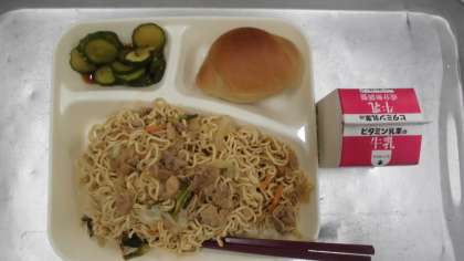 今日の給食のメニューはオイスターソース焼きそば、きゅうりの中華和え、牛乳、パン、でした。食感のあるちぢれ麺にオイスターソースがほどよくからんでおいしかったです。豚肉と細かく刻まれた野菜がたくさん入っていました。きゅうりの中華和えは米酢のさっぱり感とごま油の香りが効いていました。