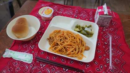 今日の給食は、イタリアンスパゲッティ、グリーンアスパラガスとキャベツのサラダ、みかんゼリー、パン、牛乳です。今日のスパゲッティの中にたくさん入っているにんじんには、カロテンが豊富に含まれています。にんじんのオレンジ色は、このカロテンによるものです。カロテンは、目や鼻、胃腸などのねんまくを健康に保つはたらきがあります。