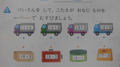 けいさんをして、こたえがおなじものを、せんでむすびましょう。