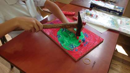 図画工作の「くぎうちビー玉ゲーム」を制作していました。金づちを使って、真っ直ぐに釘を打つことができていました。
