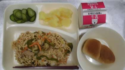 今日の給食のメニューは、焼きそば、きゅうりの生姜づけ、パイナップル(缶)、牛乳、パン、でした。焼きそばは具材に豚肉、いか、にんじん、たまねぎ、ピーマン、キャベツが入っていました。ちぢれ中華めんにソースがからんでおいしかったです。きゅうりの生姜づけはきゅうりに生姜汁がなじんであっさりとしていました。パイナップル(缶)は冷えていて甘かったです。