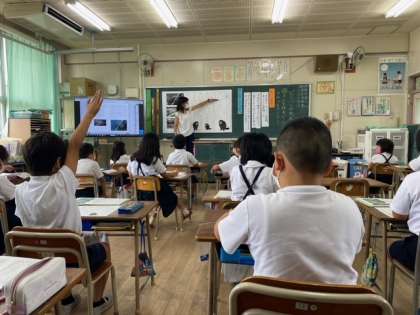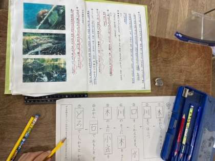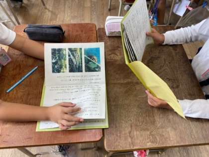 2年1組で「ビーバーの大工事」の単元で国語科の研究授業を行いました。本文の中から重要な語や文を選び出し、わかったことなどを紹介する活動でした。ビーバーの体の特徴には赤線を、ダム作りの順序がかかれているところには青線を引いて、ダムを作る順序やビーバーの様子を読み取ることができました。