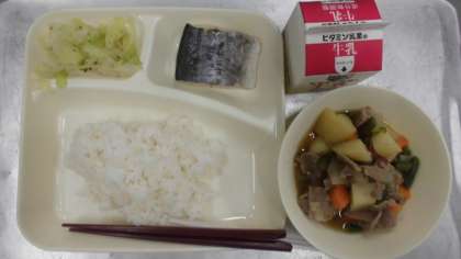 今日の給食のメニューは、さごしの塩焼き、豚肉とじゃがいもの煮物、キャベツの梅風味、牛乳、ごはん、でした。さごしの塩焼きは身がふっくらとしていてほぐしやすく、骨も少なくて食べやすかったです。豚肉とじゃがいもの煮物は甘めの和風だしで具材がしっかりと煮含められていて味がしみ込んでいました。キャベツの梅風味はさっぱりとした口当たりでほのかに梅の香りがしました。