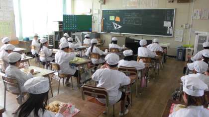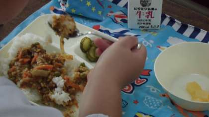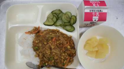 今日の給食のメニューは、大豆入りキーマカレーライス、きゅうりのピクルス、白桃(缶)、牛乳、でした。キーマカレーライスは牛豚ひき肉や細かく刻まれたたまねぎ、にんじんがにんにくやカレー粉と一緒に香りよく炒められていて、大豆も入っていたので栄養もたっぷりです。きゅうりのピクルスはあっさりとした味付けでした。白桃は甘くてやわらかく、ゼリーのようでした。