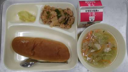 今日の給食のメニューは、豚肉と野菜のケチャップソテー、スープ、スイートポテト、牛乳、パン、でした。ケチャップソテーはケチャップの酸味がほのかに効いていて豚肉と一緒にたまねぎとピーマンがソテーされていました。スープはチキンスープをベースに塩こしょう、しょうゆで味がととのえられていて、鶏肉、キャベツ、にんじん、パセリが入っていました。スイートポテトは口になかでとろけるような上品な味わいでした。