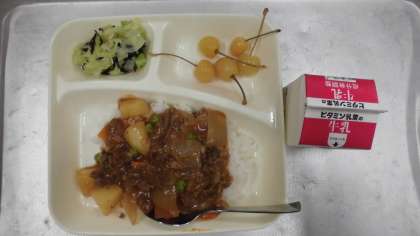 今日の給食のメニューはハヤシライス、キャベツのひじきドレッシング、さくらんぼ(缶)、牛乳、でした。ハヤシライスは米粉が使われていてアレルギー対応メニューです。牛肉の旨みもルウにとけ出していて、野菜もごろごろたくさん入っていました。キャベツのひじきドレッシングは甘酸っぱく、ひじきとキャベツが和えてありました。さくらんぼは缶詰ですが、甘くておいしかったです。