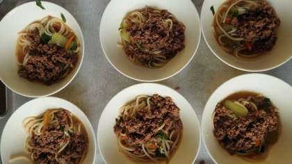 タンタンめんは、中国の四川料理を代表する麺料理です。タンタンは「坦坦」と書き、担ぐという意味があります。道具を担いで町で売り歩いたので、この名前がつきました。チンゲン菜などの野菜や味付けした肉みそをのせて食べます。