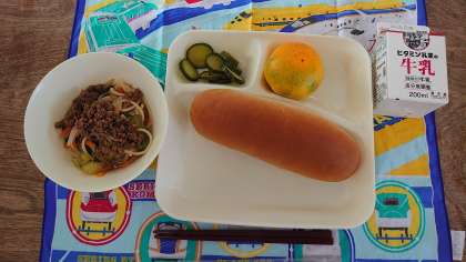 今日の給食は、タンタンめん、きゅうりの甘酢づけ、みかん、黒糖パン、牛乳です。