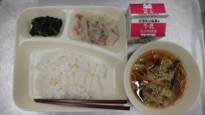 今日の給食のメニューは鶏肉のゆず塩焼き、ソーキ汁、ほうれん草のおひたし、牛乳、ごはん、でした。鶏肉のゆず塩焼きは塩とゆずで下味がつけられた鶏肉とたまねぎが香りよく焼き上げられていました。ソーキ汁はソーキと呼ばれる豚のほねつきあばら肉と大根、昆布などをかつおだしで煮込んだ汁物です。沖縄県の代表的な料理で、正月などによく食べられているそうです。とてもおいしかったです。ほうれん草のおひたしは薄めのしょうゆベースの味つけでした。
