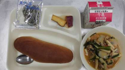 今日の給食のメニューは豚肉といかの中華煮、大学いも、ミニフィッシュ、牛乳、パン、でした。豚肉といかの中華煮は豚肉といかの他にも具だくさんで、にんじん、たまねぎ、白菜、厚揚げ、にらが入っていました。味もしっかりと濃いめについていておいしかったです。大学いもはさつまいもを油で揚げ、砂糖、塩、しょうゆなどで作ったみつがからませてありました。ミニフィッシュは一人一袋です。