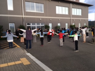 修学旅行2日目です。朝は少し曇り空です。朝一番の活動は、ラジオ体操です。今日も一日元気を出して、頑張りましょう。