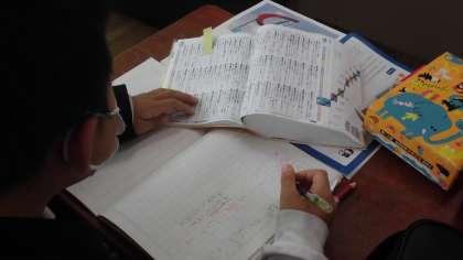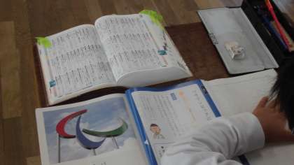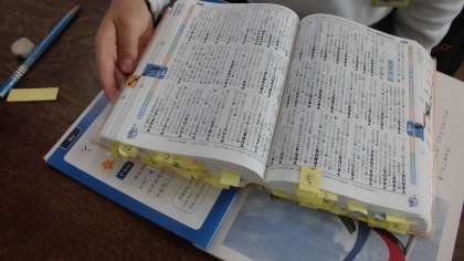 3年生がしっかりと国語辞典を使って授業を受けていました。教科書を読んで意味がわからない言葉が出てきたときにはすぐに辞典で調べるようにしています。調べたことばには付せんがはってありました。たくさん調べたようすがわかります。