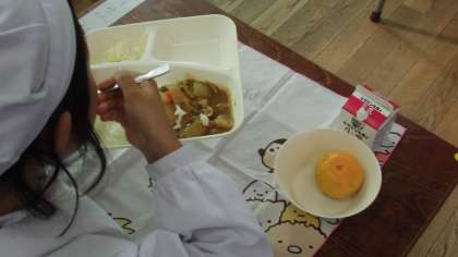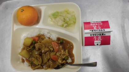 今日の給食のメニューはポークカレーライス、キャベツのピクルス、みかん、牛乳、でした。ポークカレーライスは豚肉、たまねぎ、にんじんをにんにくとセロリと一緒に香りよく炒めて、じゃがいもがやわらかくなるまでゆっくり煮込んでいます。今日は米粉のカレールウを使用しています。まろやかに仕上がっていました。キャベツのピクルスはさっぱりとした口あたりでした。みかんは果汁が多く甘かったです。