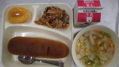 今日の給食のメニューは、なすのミートグラタン、鶏肉と野菜のスープ、黄桃(缶)、牛乳、パン、でした。なすのミートグラタンは牛豚ひき肉、なす、たまねぎ、マカロニが入っていて、焦げ目もあり香ばしく焼き上げられていました。鶏肉と野菜のスープはチキンスープをベースに塩こしょう、しょうゆで味がととのえられていて、鶏肉、にんじん、キャベツ、じゃがいも、コーン、パセリが入っていました。黄桃(缶)は甘くて冷えていました。