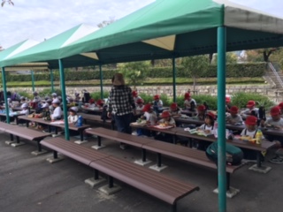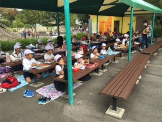 午前の活動が終わり、お弁当の時間です。朝からしっかり歩いたので、お腹が空いています。みんな美味しくいただいています。