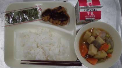 今日の給食のメニューは、みそカツ、じゃがいもと野菜の煮物、焼きのり、牛乳、ごはん、でした。みそカツはころもがサクッと揚げられていて、八丁みそや赤みそなどをまぜて作った特製たれがかけられていました。じゃがいもと野菜の煮物は甘めの和風だしで具材がしっかりと煮込まれていて、やさしい味に仕上がっていました。焼きのりは一人一袋です。味がついていない方でした。