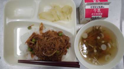 今日の給食のメニューは、タコライス、もずくのスープ、焼きじゃが、牛乳、でした。タコライスは沖縄のソウルフードだそうです。タコがたっぷり入ったライスではありません。メキシコ料理のタコスがヒントになっています。タコスとはスパイシーに炒めたひき肉やたまねぎなどをトウモロコシで作った薄い生地の上にのせてくるめたものにトマトベースのサルサソースをかけて食べる料理です。そのタコスで使う具材とサルサソースをごはんの上にのせて食べるのがタコライスであり、タコス+ライスということでタコライスと名付けられたそうです。おいしかったです。給食では時々、郷土料理が出るので楽しみです。