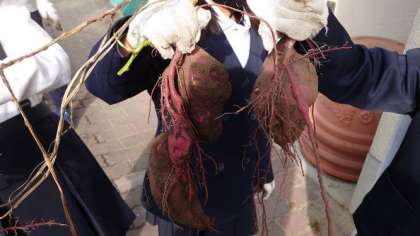 2年生が学習園で一生懸命育てたおいもを収穫しました。「うんとこしょどっこいしょ」大きなサツマイモがとれました!!
