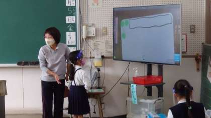 1年1組で算数科「ひきざん」の授業研究が行われました。くり下がりのある引き算を、10のまとまりをつくり、そこから引くことがわかりました。おはじきやブロックを使って答えを確認することができました。また、自分の考えを隣の人に教えることもできました。