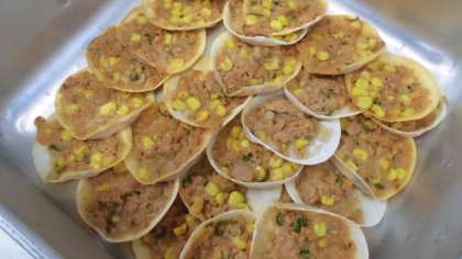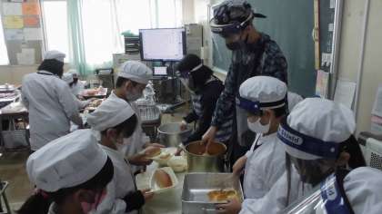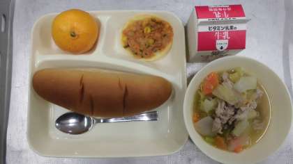今日の給食のメニューは、豚肉と野菜のスープ煮、変わりピザ、みかん、牛乳、パン、でした。豚肉と野菜のスープ煮は塩こしょう、しょうゆ、チキンブイヨンで味つけをし、豚肉とにんじん、たまねぎ、キャベツ、じゃがいも、マッシュルーム、グリンピースが入っていました。じゃがいもがやわらかくホクホクでした。変わりピザは餃子の皮に具をのせて焼いています。おいしいですからおやつ代わりに一度ご家庭でも試してみてはいがでしょうか。みかんは果汁が多く甘かったです。