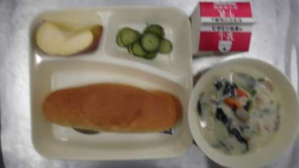 今日の給食のメニューは、きのこのクリームシチュー、きゅうりのバジル風味サラダ、りんご、牛乳、パン、でした。きのこのクリームシチューは小麦粉からルウを作っています。クリーミーでとてもおいしかったです。日本には食べられるきのこが約100種類ありますが、給食には7種類のきのこが使われています。エリンギ、えのきたけ、まいたけ、しめじ、しいたけ、なめこ、マッシュルームです。今日のシチューにはエリンギ、しめじ、マッシュルームが入っていました。きゅうりのバジル風味サラダはさっぱりとした口あたりでした。りんごは一人4分の1切れです。