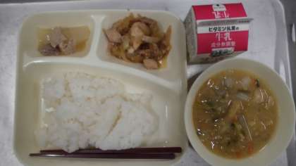 今日の給食のメニューは、鶏肉の甘辛焼き、みそ汁、大根の煮物、牛乳、ごはん、でした。鶏肉の甘辛焼きは甘辛くしょうゆ味で下味がつけられていて香ばしく焼き上げられていました。付け合わせのたまねぎもしんなりしていておいしかったです。みそ汁はだしがしっかりととられていて、にんじん、白菜、うすあげ、えのき、青ねぎが入っていました。大根の煮物は豚肉と一緒に和風仕立てでやわらかくなるまで煮られていて、とろみもついていました。
