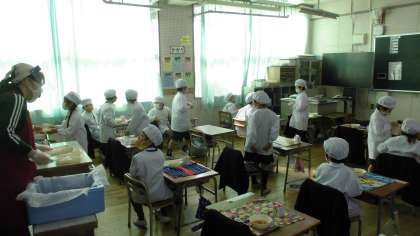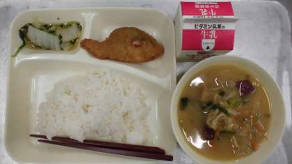 今日の給食のメニューは、たらフライ、さつまいものみそ汁、きくなと白菜のごま和え、牛乳、ごはん、でした。たらフライはころもはサクッとした食感で、たらの身はふっくらとしていました。さつまいものみそ汁はさつまいもが入っているので少し甘みがあっておいしかったです。その他にも、うすあげ、たまねぎ、にんじん、もやし、青ねぎが入っていました。きくなと白菜のごま和えはごまの風味が感じられ、おひたしのようでした。