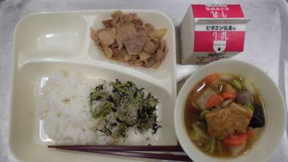 今日の給食のメニューは、じゃこ菜っ葉ごはん、豚肉のスタミナ焼き、厚揚げと冬野菜のあったか煮、牛乳、でした。今日の給食は、学校給食献立コンクール最優秀作品でした。寒い季節を元気に過ごすために食欲がわくメニューです。ちりめんじゃことだいこん葉でごはんを食べやすくし、にんにくと白みそで豚肉を風味よく焼きます。これに旬の冬野菜を使い、でんぷんでとろみをつけた体が温まる煮物を組み合わせています。
