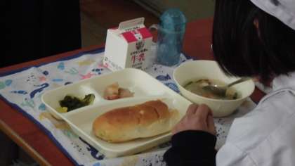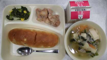 今日の給食のメニューは、鶏肉のオイスターソース焼き、ワンタンの皮と豆腐のスープ、チンゲンサイとコーンの中華和え、牛乳、パン、でした。鶏肉のオイスターソース焼きは鶏肉に生姜汁、にんにく、オイスターソースなどで下味をつけて香ばしく焼き上げられていました。ワンタンの皮と豆腐のスープは中華スープに豚肉、にんじん、たまねぎ、豆腐、もやし、ワンタンの皮、にらが入っていて、具だくさんでした。チンゲンサイとコーンの中華和えは酢とごま油が効いていて、チンゲンサイがしんなりとしていました。