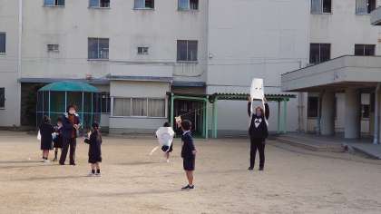 1年生が運動場で、自分で絵をかいた凧を上げていました。運動場を何度も走ったり、友だちと協力したりしてあげる姿が微笑ましかったです。 ♪ たこ たこ あがれ 風よくうけて 雲まであがれ 天まであがれ〜