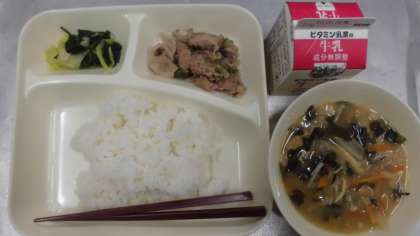 今日の給食のメニューは、豚肉のごまだれ焼き、みそ汁、きくなと白菜のおひたし、牛乳、ごはん、でした。豚肉のごまだれ焼きは手づくりのごまだれで豚肉とたまねぎ、ピーマンに下味をつけて香ばしく焼き物機で焼いてありました。220度で15分間焼くそうです。ごはんがすすみました。みそ汁はにぼしでだしがとられていました。にんじん、大根、うすあげ、えのきたけ、わかめが入っていて野菜中心のみそ汁でした。きくなと白菜のおひたしは薄めのしょうゆ味でおいしかったです。