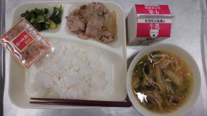 今日の給食のメニューは豚肉の生姜焼き、さつまいものみそ汁、菜の花のおひたし、牛乳、ごはん、でした。豚肉の生姜焼きは味がしっかりとついていて、たれが豚肉だけでなくたまねぎにもしみ込んでいて、ごはんがすすみました。さつまいものみそ汁は具だくさんで、さつまいもの甘みもとけ出してやさしい味でした。菜の花のおひたしは春が感じられました。