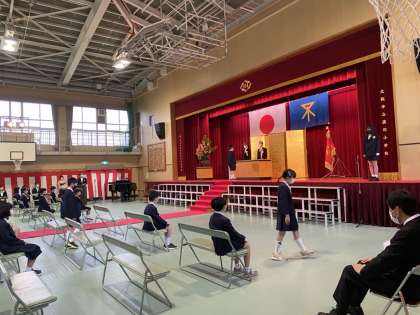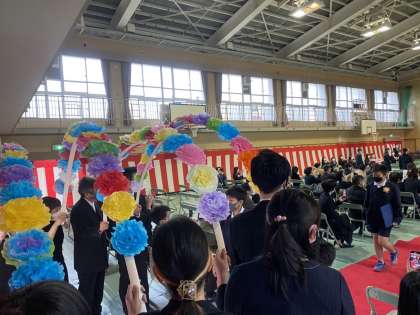 本日無事、第100回卒業式を挙行することができました。舞台上では一人一人感謝の言葉や将来の夢などを力強く語り、そして校長先生から堂々と卒業証書を受け取ることができました。あいにくの雨模様ではありましたが、晴れ晴れとした気持ちで、49名が巣立っていきました。夢に向かって元気に羽ばたいてください。本日は、本当におめでとうございました。