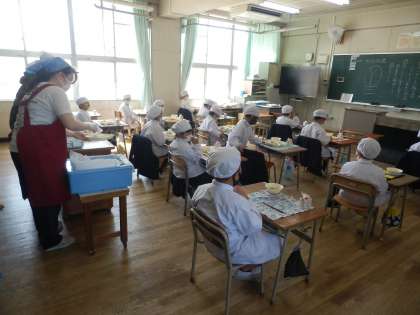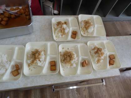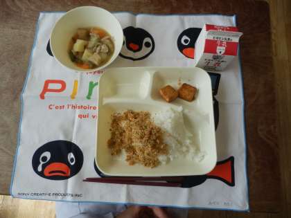 今日の給食は、ごはん、牛乳、鶏肉とじゃがいもの煮もの、あつあげのしょうゆだれかけ、紅ざけそぼろです。ごはんにもよく合う、紅ざけそぼろですが、給食では紅ざけといりごま、あおのりを炒って作ります。素材の味をいかすために、料理酒、みりん、薄口しょうゆだけで味付けしています。