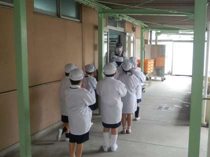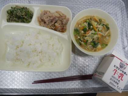 今日の給食は、豚肉のしょうが焼き、みそ汁、じゃこピーマン、ごはん、牛乳です。