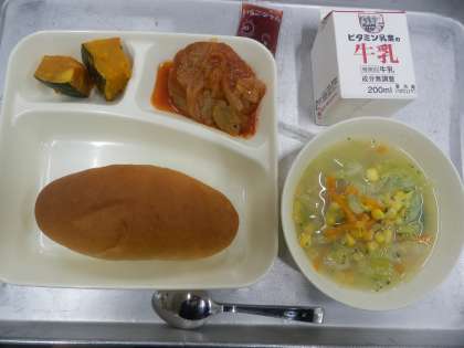 今日の給食は、煮込みハンバーグ、コーンとキャベツスープ、焼きかぼちゃです。