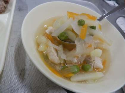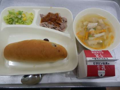 今日の給食は、レーズンパン、牛乳、豚肉のデミグラスソース、スープ、キャベツとコーンのソテーです。給食は、みなさんの心や体が健康に成長することができるように栄養のバランスが考えられています。「食べ物にはどんな働きがあるのかな?」「この食べ物は、どこの地域の料理だろう」などの関心を持つことで、給食から様々なことを学ぶことができます。