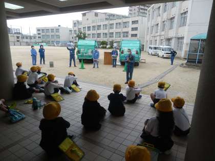 4年生の社会科の「ごみのゆくえ」の学習で、パッカー車体験が行われました。大きなたんすをパッカー車で処理する様子を見たり実際にパッカー車に乗せてもらったりしました。またペットボトルやプラスチックごみ等の分別することの大切さも学び、クイズ形式に楽しく学ぶことができました。