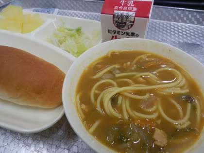 今日の給食は、カレースープ、キャベツのピクルス、りんごの缶づめ、コッペパンブルーベリージャム、牛乳です。キャベツはすずしいところで育ち、春のキャベツは葉が柔らかいです。かぜなどのウイルスから体を守るビタミンCが多く含まれています。