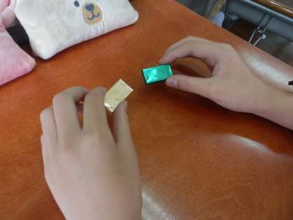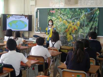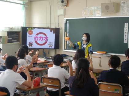 6年生に株式会社明治さんから、なるほどがいっぱいチョコレートについて教えていただきました。カカオはそのまま日本に運ばれてくるわけではありません。カカオ農家が手間暇かけてチョコレートの原料になるカカオ豆にします。今日は、カカオ72%のチョコレートとミルクチョコレートの食べ比べをし、色や香り、味やとけ方の違いを比べてみました。