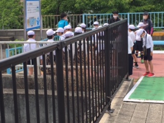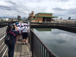 柴島浄水場の施設を見学しています。水作りの行程を見ています。
