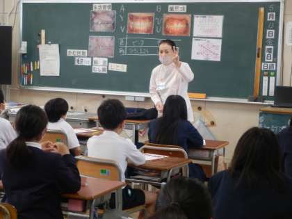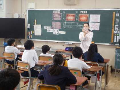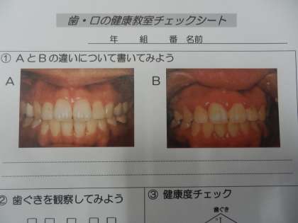 歯周病の予防するには、どのようにすればよいのかや、歯磨きをしていても歯垢のたまりやすいところを図を用いて説明してくれました。今日からより丁寧に歯を磨いてほしいです。